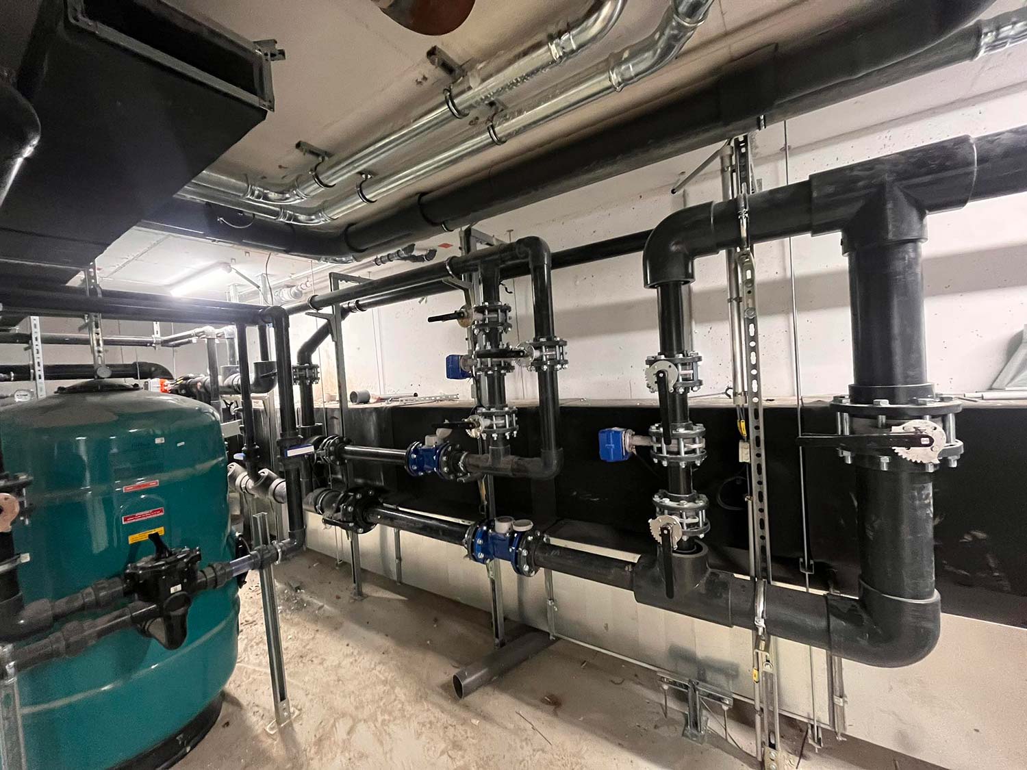 Bizonyos gépészeti elemeket a medencetest falába, néhányat pedig a padlóba helyezünk el. Ezeket hívjuk szerelvényeknek, amik már az építés során a helyükre kerülnek. A többi gépészeti elem a gépházban kap helyet.